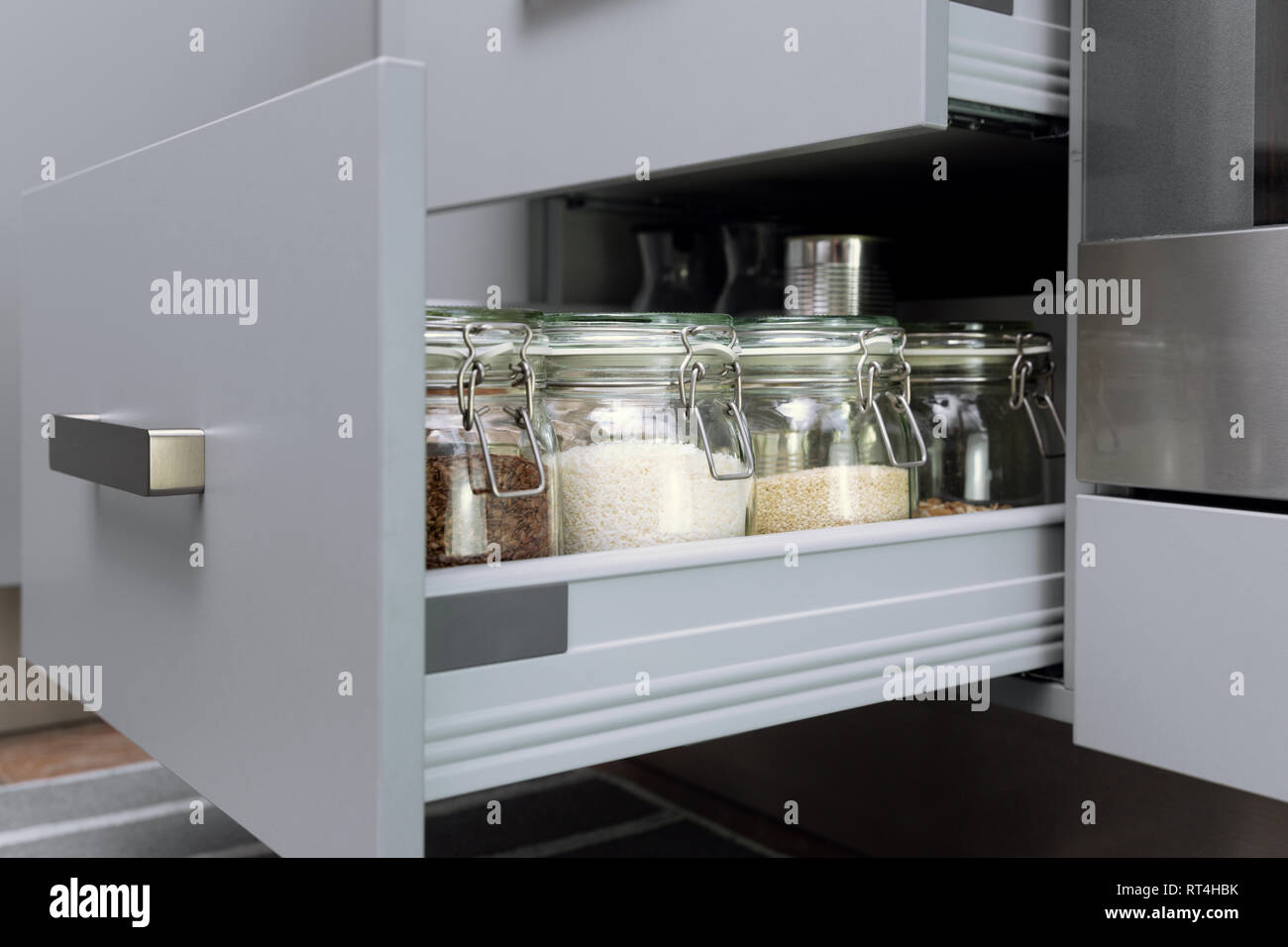 Various Seeds In Storage Jars In Pantry White Modern Kitchen